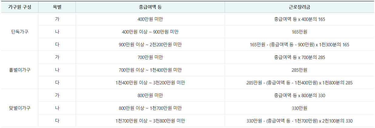근로/자녀 장려금 모두 전년도 연간 부부합산 총급여액 등을 기준으로 아래의 해당 산식을 반영한 장려금 산정표에 따라 계산됩니다.