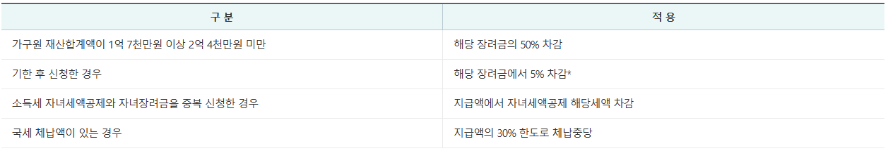✅ 재산가액에서 부채는 차감하지 않으며, 재산합계액 1억7천만원 이상이면 장려금 지급액의 50%를 차감