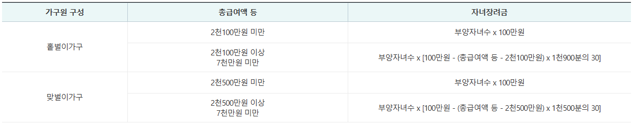 ✅ 자녀장려금은 자녀양육을 지원하기 위해 부부의 총소득이 7,000만 원 미만이면서 18세 미만의 부양자녀가 있는 경우 1명당 최대 100만 원을 지급하는 제도입니다.