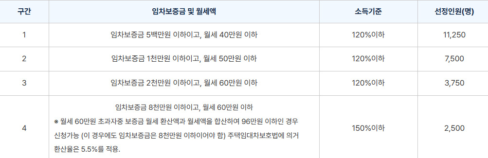 임차보증금과 월세 및 소득을 기준으로 4개 구간을 나누어 선정한 후 인원이 초과될 시 구간별로 전산 추첨